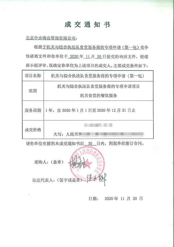 机关与综合执法队食堂服务商的专项申请项目成功中标