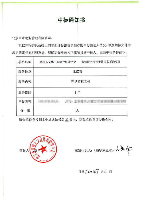 残疾人文体中心餐饮服务采购项目成功中标