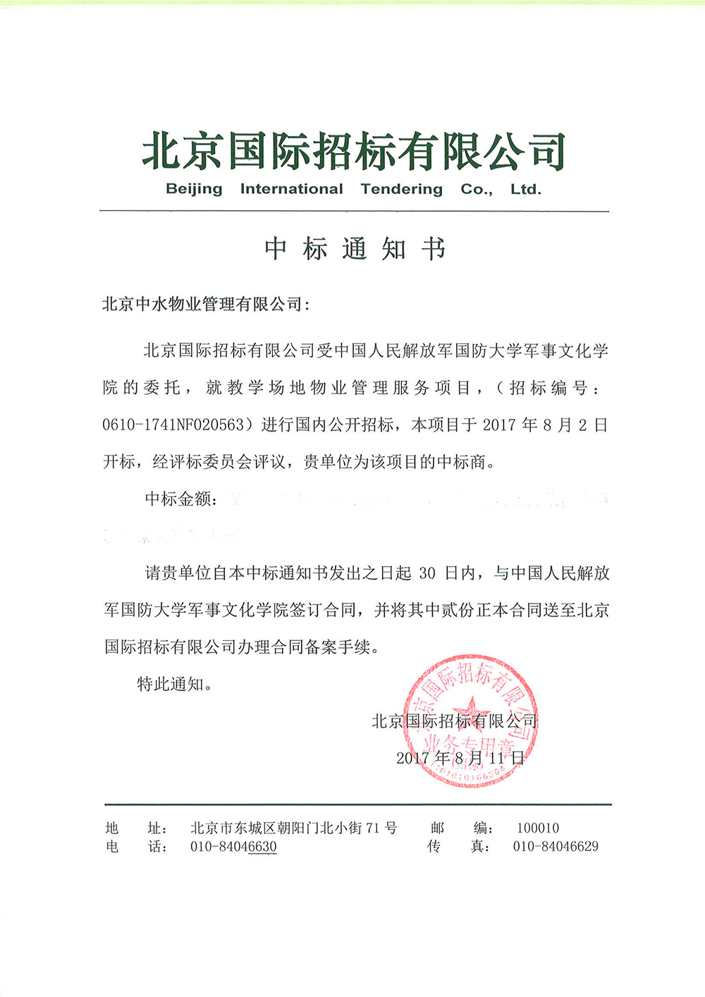 中国人民解放军国防大学军事文化学院教学场地物业管理服务项目成功中标