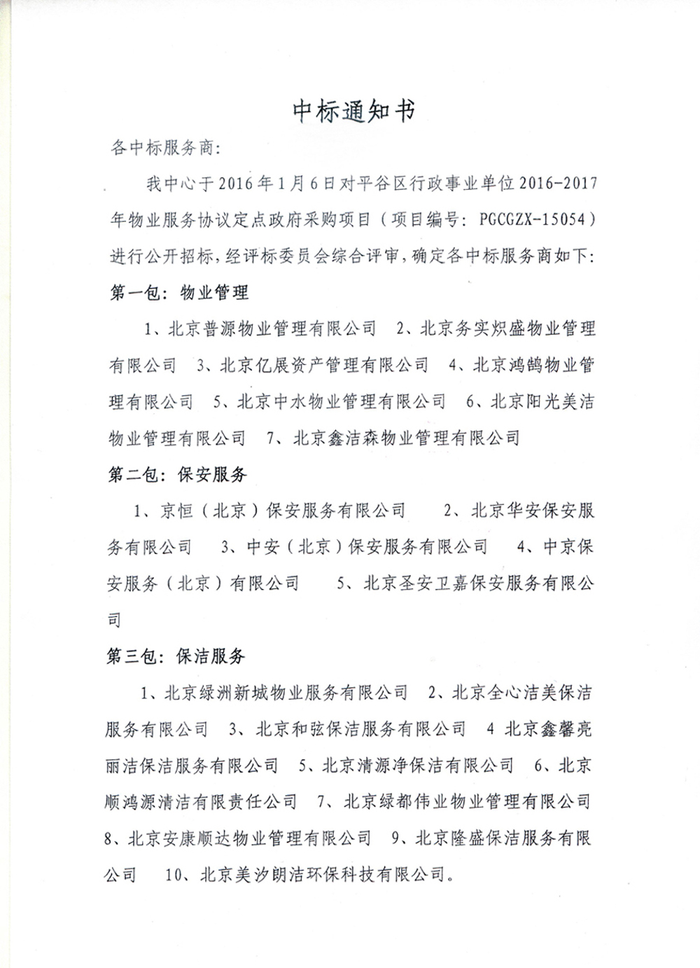 成功获得平谷区政府采购中心一级物业服务公司供应商资格